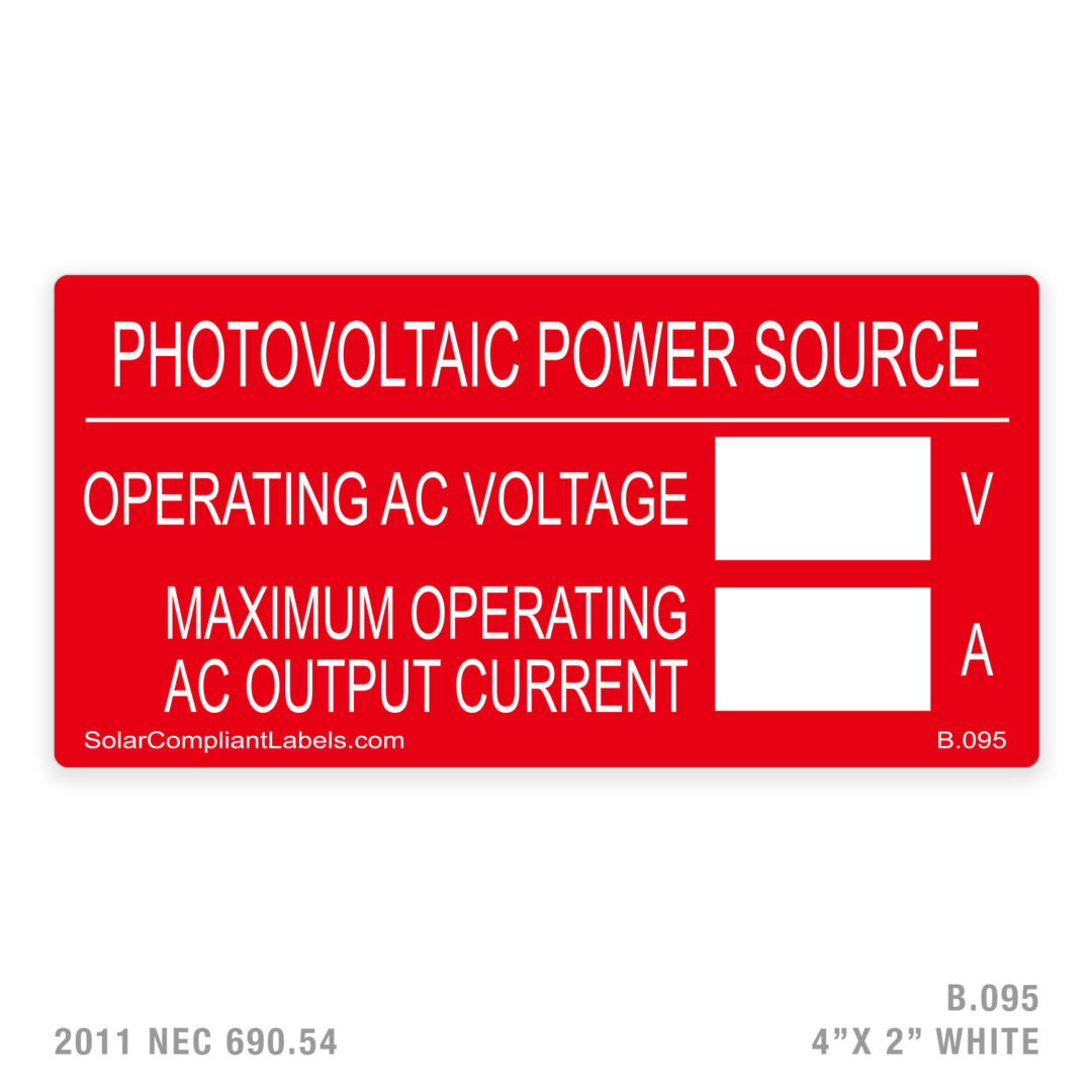 Solar Label -Warning Photovoltaic Power Source - Conduit Label - NEC ... WARNING: PHOTOVOLTAIC POWER SOURCE. NEC 690.4(F), NEC 690.31(E)(4) Place on all DC source markings. Place on DC Conduit every 10 ft. (IFC 605.11.1.1 and IFC 605.11.1.2) Solar Warning Label. Premium outdoor rated vinyl label, red with white letters. 5.75" X 1.125" with minimum 3/8" letter height; Permanent adhesive; Polyester film lamination