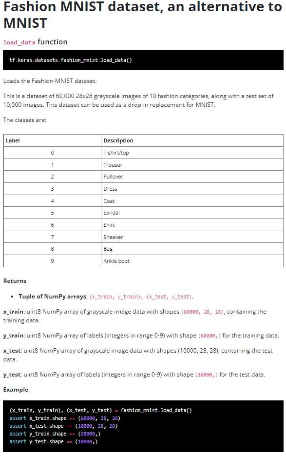 Fashion-MNIST using Machine Learning | CloudxLab Blog Fashion MNIST Training dataset consists of 60,000 images and each image has 784 features (i.e. 28×28 pixels). Each pixel is a value from 0 to 255, describing the pixel intensity. 0 for white and 255 for black. The class labels for Fashion MNIST are: Let us have a look at one instance (an article image) of the training dataset. Fashion MNIST — cvnn 0.1.0 documentation - Read the Docs fashion_mnist = tf.keras.datasets.fashion_mnist (train_images, train_labels), (test_images, test_labels) = fashion_mnist.load_data() Loading the dataset returns four NumPy arrays: The train_images and train_labels arrays are the training set—the data the model uses to learn.